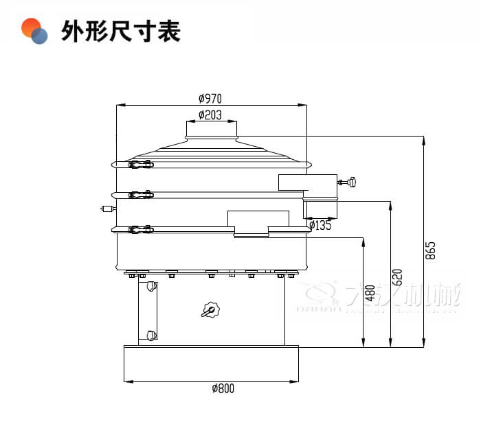 圓形振動篩主要由進料口、防塵蓋、出料口、束環、篩網、配重塊、上部重錘、振動電機、彈簧、下部重錘、機座等部分組成。篩機采用直立式電機作激振源,當篩機啟動后,電機上、下兩端安裝的偏心重錘,將電機的旋轉運動轉變為水平、垂直、傾斜的三次元運動,再把這個運動傳遞給篩面。在此過程中,小于篩面孔徑的物料通過篩孔落到下層,成為篩下物,大于篩面孔徑的物料經連續跳躍運動后從排料口排出,用戶通過調節上、下兩端重錘的相位角,可以改變物料在篩面上的運動軌跡,從而設計實現對物料的篩分。