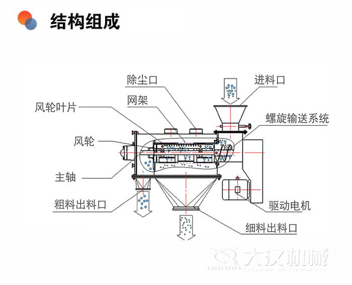 臥式氣旋篩由進料口、除塵口、網籠、螺旋輸送系統、風輪葉片、風輪、主軸、驅動電機、粗料出料口、細料出料口組成。