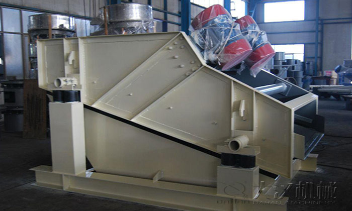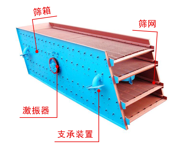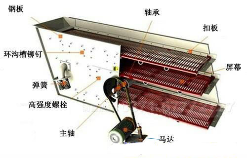 電動機經(jīng)三角帶使激振器偏心塊產(chǎn)生高速旋轉(zhuǎn)。運轉(zhuǎn)的偏心塊產(chǎn)生很大的離心力,激發(fā)篩箱產(chǎn)生一定振幅的圓運動,傾斜篩面上的物料在受到篩箱傳給的沖量下而產(chǎn)生連續(xù)的拋擲運動,在此過程中,小于篩孔的顆粒物料通過篩網(wǎng)透篩,從而達到分級的目的。