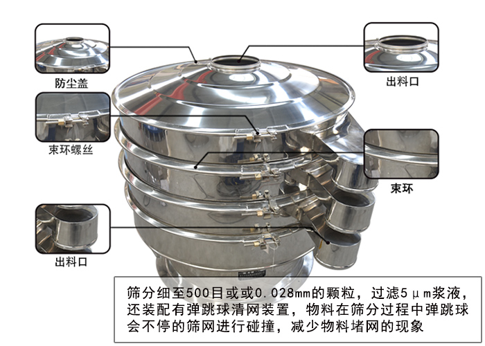 可篩分細至500目或或0.028mm的顆粒,過濾5μm漿液,大漢一米不銹鋼振動篩在篩分精度上成就顯著,另外還專門裝配有彈跳球清網裝置,物料在篩分過程中彈跳球會不停的篩網進行碰撞,減少物料堵網的現象,進一步提高一米不銹鋼振動篩的篩分精度與效率。