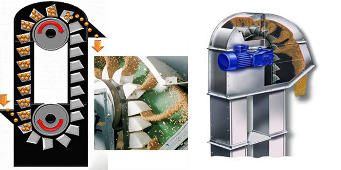 TD型斗式提升機采用橡膠輸送帶作為牽引構件,以掏取式來完成物料的裝載。裝載的進料口設在設備的尾部,這樣更有利于物料的裝載輸送。當物料通過進料口被放入提升機底端后,使畚斗(即料斗)在輸送帶的牽引下,裝入物料勻速向上運行;當載有物料的畚斗運行至頂端,以離心式或者混合式方式卸料;這樣就完成提升機的整個輸送過程。