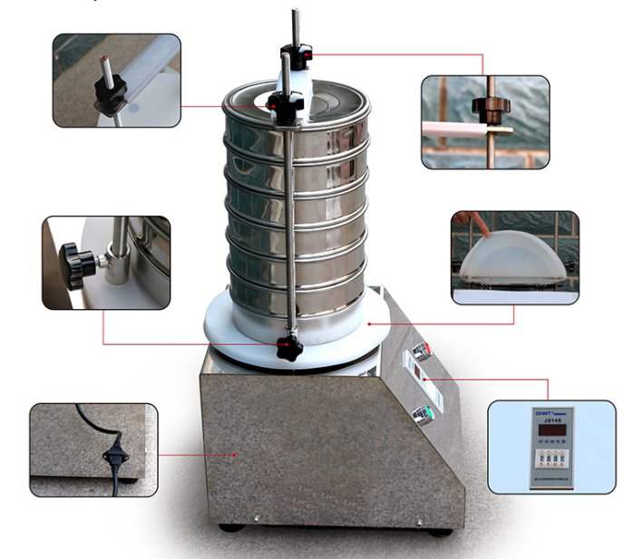 試驗篩機以立式振動電機作為整機振動源,通過振動電機帶動上部振動盤振動,再通過振動盤傳導至安放在振動盤上部的篩框上,然后由需要檢測目數的篩框把小于篩網孔徑的物料顆粒篩分至下層篩框,經過這樣的篩分程序,使每層試驗篩內只留相同粒度的物料,達到不同粒度的分離并確定此物料的粒度組成,使篩框中的物料能夠得到非常有效地過濾、分級、篩分。